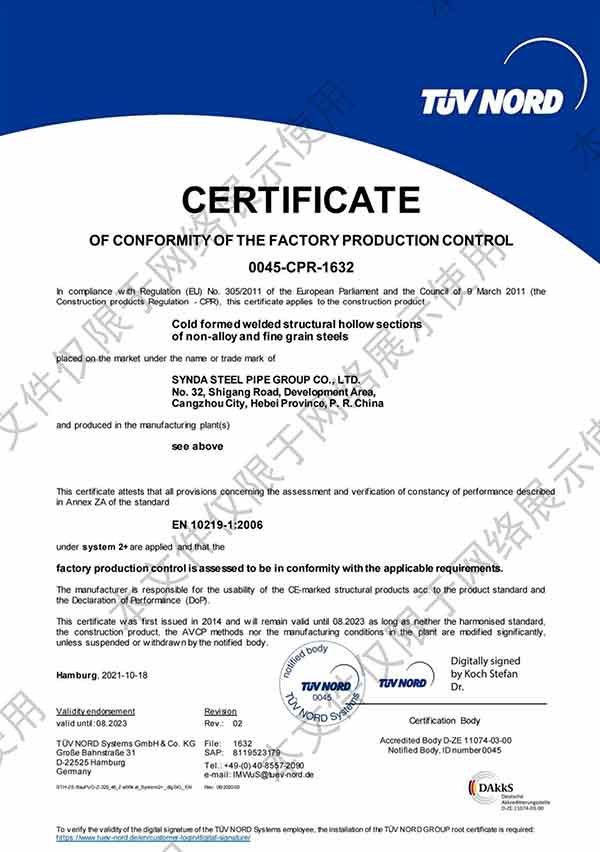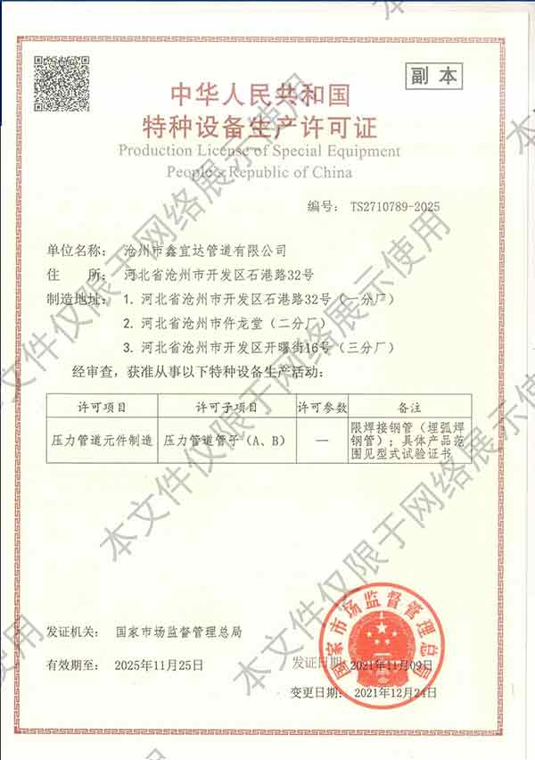 滄州市鑫宜達管道有限公司成立于2003年7月,坐落于滄州經(jīng)濟開發(fā)區(qū),占地面積40萬平方米,注冊資金1.81億元,是集螺旋鋼管生產(chǎn)、防腐加工以及無縫鋼管、卷板、帶鋼等品類鋼材經(jīng)營銷售于一體的工貿(mào)型企業(yè)。公司現(xiàn)有員工400多人,其中,中高級技術(shù)職稱的人員達120余名。 滄州市鑫宜達管道有限公司擁有9條螺旋鋼管生產(chǎn)線和3PE防腐生產(chǎn)線,可生產(chǎn)直徑219--3640mm,壁厚5.5--28mm,最高鋼級X100的各種規(guī)格防腐螺旋鋼管...